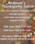 You’re Invited to Our Thanksgiving Lunch! Thursday, November 20, 2025 Adult Guest Meal: $5.16 Child Guest Meal: $3.25 Please Note: This is a prepay cash-only event. No payments will be accepted at the door. . . .
