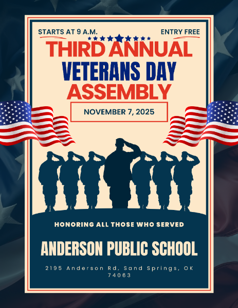 Veterans Day is fast approaching, and Anderson School is honored to recognize the brave men and women who have served our country. We will be hosting a special assembly on November 7, at 9:00 AM to celebrate and show our gratitude for their service.